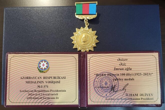 Suraxanı Rayon İcra Hakimiyyətinin başçısı Əziz Əzizov “Heydər Əliyevin 100 illiyi (1923-2023)” yubiley medalı ilə təltif edilib.Sozcu.info xəbər verir ki, Azərbaycan Respublikasının Prezidenti cənab İlham Əliyevin müvafiq Sərəncamına uyğun olaraq 2023-cü il “Heydər Əliyev İli” elan olunub. Bu əlamətdar il ilə bağlı təsdiqlənmiş “Tədbirlər Planı”na əsasən, “Heydər Əliyevin 100 illiyi (1923-2023)” yubiley medalı təsis edilib. Azərbaycan Respublikası Prezidentinin 02 fevral 2024-cü il tarixli Sərəncamı ilə bir sıra şəxslər “Heydər Əliyevin 100 illiyi (1923-2023)” yubiley medalı ilə təltif olunublar.Sərəncama əsasən Suraxanı rayonundan Rayon İcra Hakimiyyətinin başçısı Əzizov Əziz İmran oğlu, A.Səfərov adına 114 nömrəli tam orta məktəbin direktoru Novruzova Ceyran Kamal qızı, Rayon Ağsaqqallar Şurasının sədri Babayev Arif Eyvaz oğlu, Hövsan Mədəniyyət Mərkəzinin direktoru Rəhimov Vasif Aydın oğlu da "Heydər Əliyevin 100 illiyi (1923-2023)" yubiley medalı ilə təltif ediliblər.Suraxanı Rayon İcra Hakimiyyətinin başçısı Əziz Əzizov ali təltifə görə Möhtərəm Prezident İlham Əliyevə dərin minnətdarlığını ifadə edib və bildirib ki, bundan sonra da, Ulu Öndər Heydər Əliyev ideallarına sadiq qalaraq, ərazi bütövlüyünü və suverenliyini bərpa etmiş Azərbaycanın davamlı tərəqqisi və parlaq gələcəyi naminə Müzəffər Ali Baş Komandanın fəaliyyətində göstərilən etimadı doğrultmaq, dövlətə, dövlətçiliyə sədaqət nümayiş etdirməklə qarşıya qoyulan vəzifələrin öhdəsindən layiqincə gəlmək üçün əlindən gələni əsirgəməyəcək.
