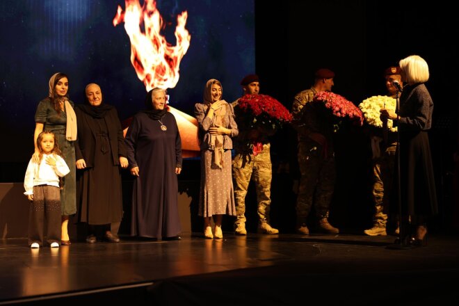 Tədbir iştirakçıları — şəhid anaları, qazilər və qonaqlar əllərində üçrəngli Azərbaycan bayrağını qaldıraraq ayağa qalxdılar. Mahnının sədaları altında zalı qürur, minnətdarlıq və Vətən sevgisi bürüdü.